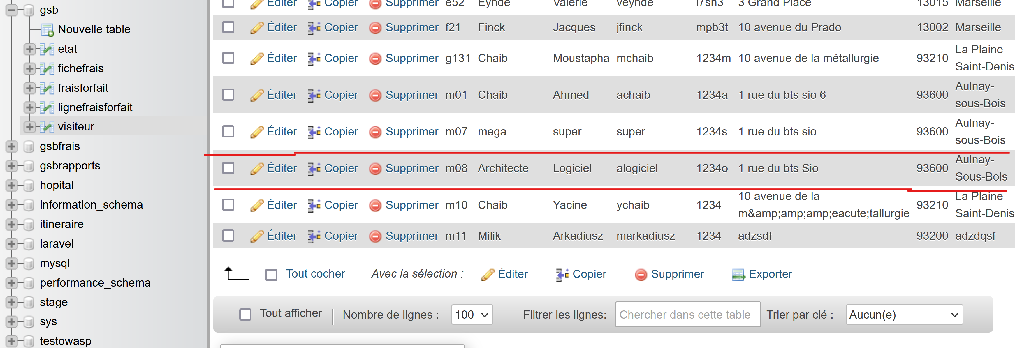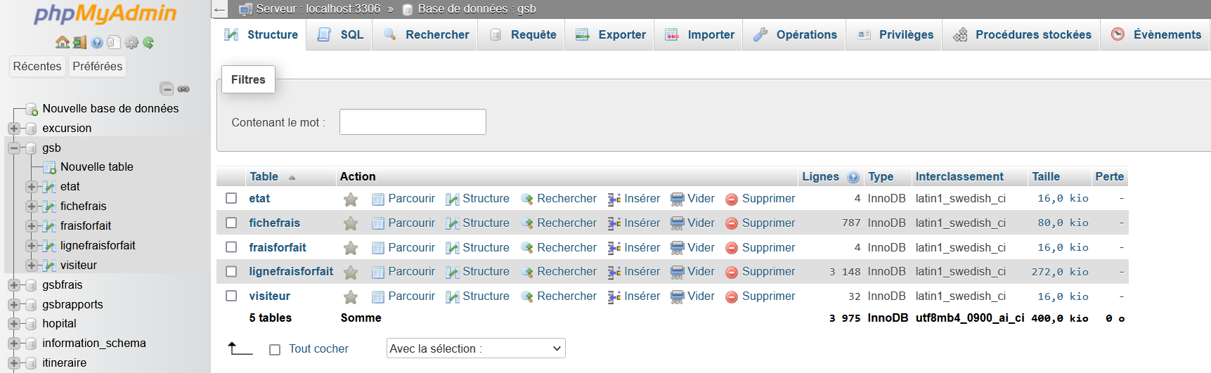 Création d'une base de données : Créer une base de données gsbfrais et exécuter le script "gsb.sql" de création des tables et d’insertion des lignes avec l’interface PhpMyAdmin.